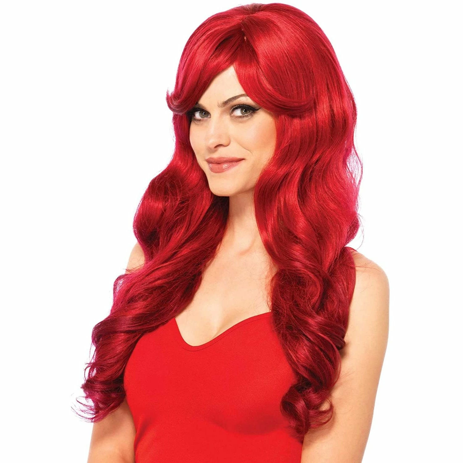 27″ Long Wavy Parted Fringe Red Costume Wig by Leg Avenue. From femme fatales to comic book heroines, the 27″ Long Wavy Wig is the perfect wig for all those curly-haired cuties in the world. This classic wig features long wavy locks, with long parted fringe and adjustable wig cap for comfortable wear. This babe-worthy wig is the perfect way elevate a Halloween costume or festival outfit. Made from 100% synthetic fibers.
