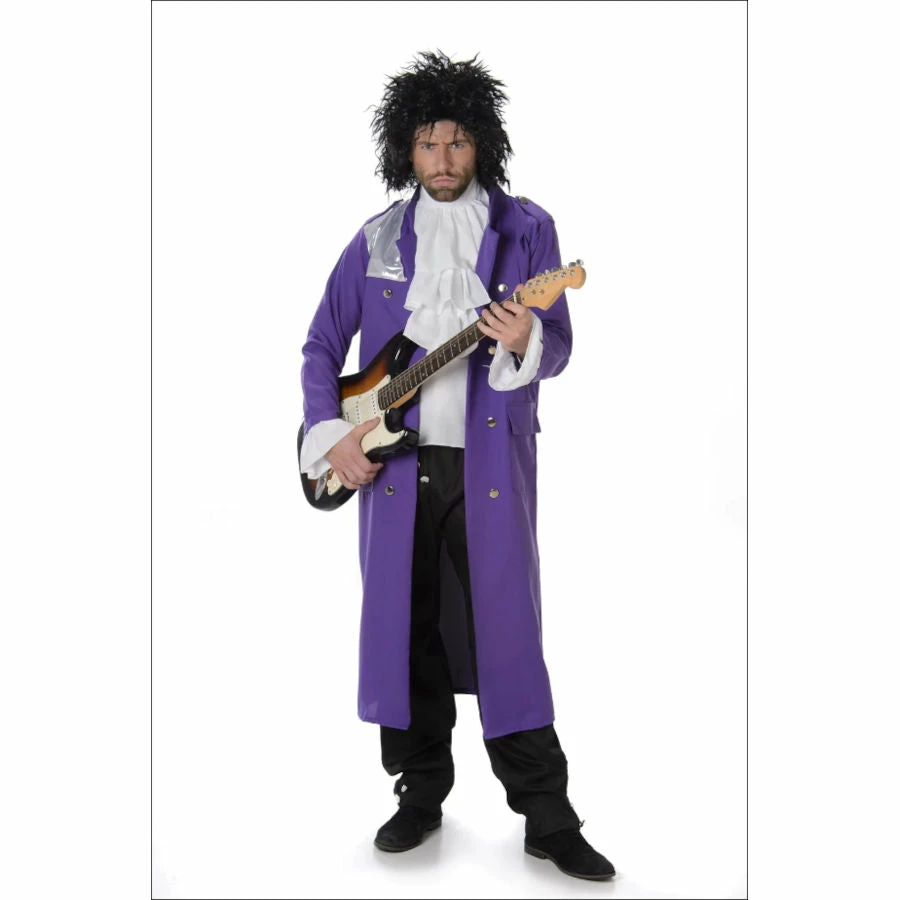 80’s Pop Icon Costume with long purple jacket with silver accent on one shoulder two pockets, button detail and white frilly cuffs. Wear the white frilly dicky over your own white shirt. Pants with button detail on the front and hem. Prince is considered one of the best-selling musicians of all time.