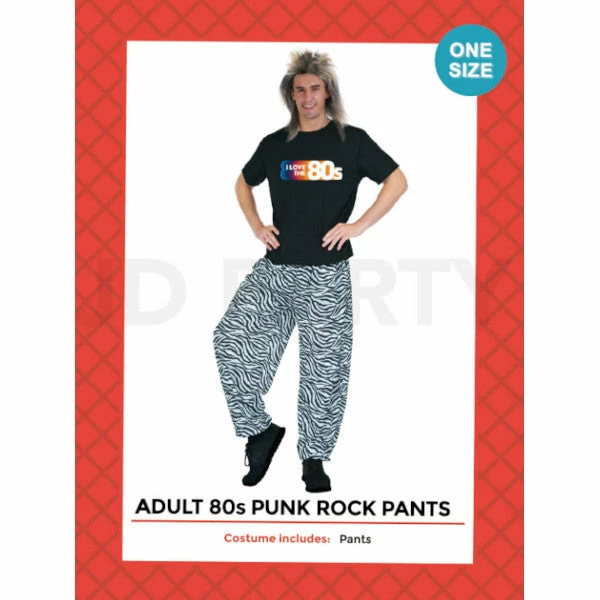 Dress as a Totally Rad kid from the 80’s with these zebra print adult 80’s Punk Rock Pants. Team with a Back to the 80’s t-shirt and mullet or rocker wig and you are ready to party.