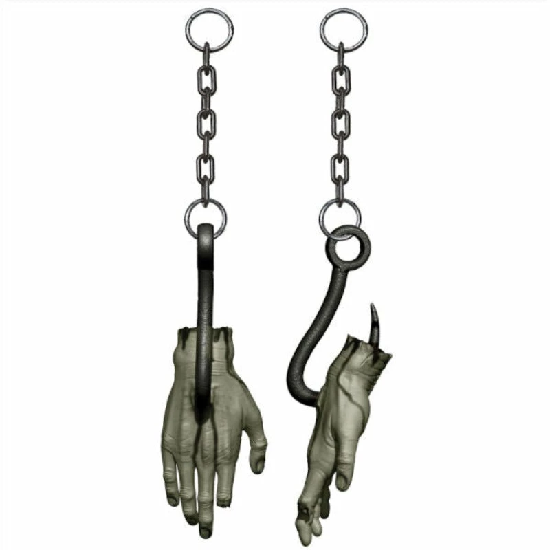 Bloody Zombie Hand with severed finger on meat hook will freak out your halloween guests.