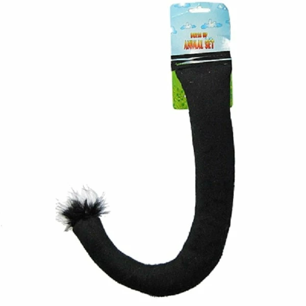 Black animal tail with a small amount of fluff on the tip, measures 46 cm long and has a curl in the tail.