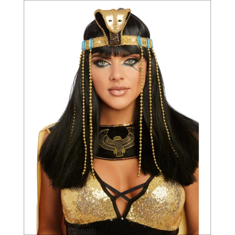 Exquisite golden Cleopatra headpiece with Cobra, turquoise rhinestone embellishment, and six strands of gold beads. Check out our range of Cleopatra costumes and Wigs.