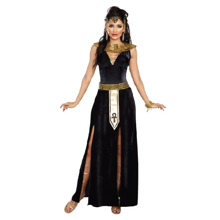 This exquisite Queen of the Nile always leaves them with a smile. Become the queen of desire in this black velvet gown with Egyptian embossed pattern, front slits and gold trim detailing. Complete the look with a Snake Crown and Wig.