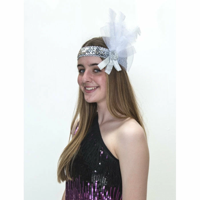 Deluxe flapper headband in silver with white feathers with ribbon and rose detail.