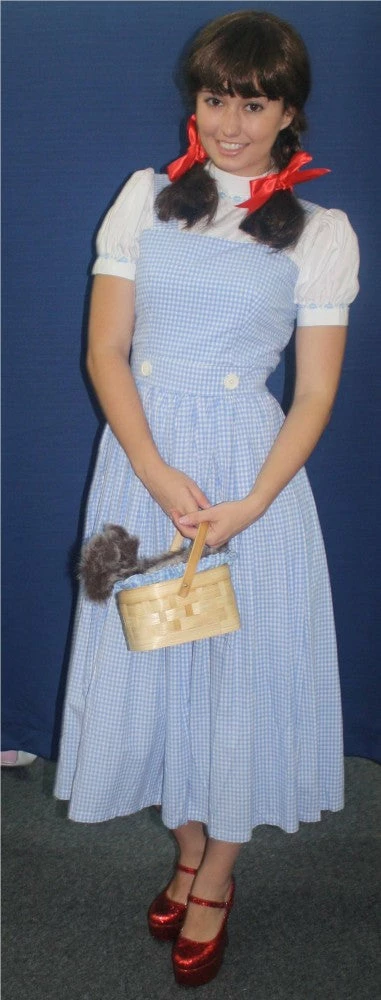Old fashion Kansas girl with blue and white check dress with white puffy sleeves.