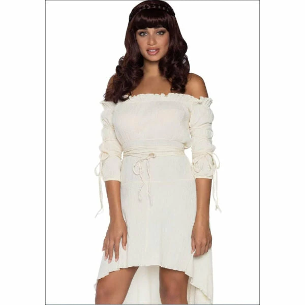 Flowy, sexy and oh so boho, the Leg Avenue Gauze High Low Peasant Dress in ivory with tie up details is the perfect dress for any occasion! From casual wear cute to ravishing renaissance babe, stay cool and comfy in this flowing, lightweight dress. A flirty high-low skirt shows off just the right amount of leg, while light fabric flows with every step for a dramatic and romantic effect. A soft elastic band at the top of the dress is sure to keep the sexy off-the-shoulder look in place with a cute ruffle edge design. Use the tie up sleeves and waist to make the dress as loose-fitting or as curve hugging as you’d like.