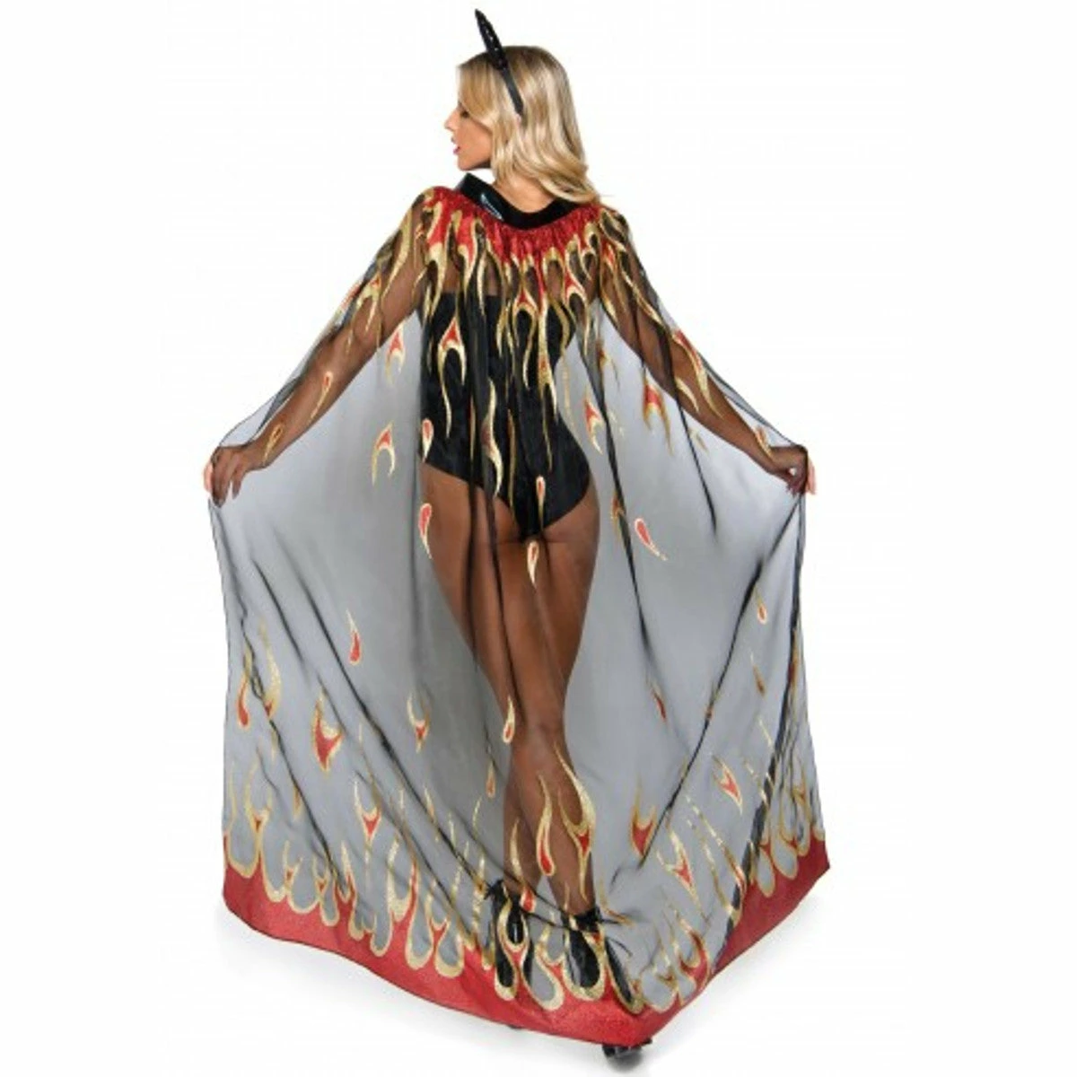 This fabulous costume features a sheer translucent floor length black cape with glittering flames around the base and shoulder area, it also included is a black devil horn headband with glittery red cord.