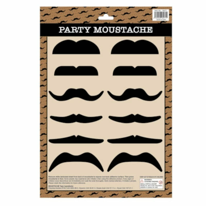 The Party Moustache Set offers hilarious self-adhesive black mini moustaches which are the perfect costume accessory for your Super Mario, Mexican Fiesta, Movember, or Detective Party!! This card of 12 moustaches is great to share with your friends and family!! Simply remove the moustache from the cardboard, peel off the adhesive tape, and stick on your face!!