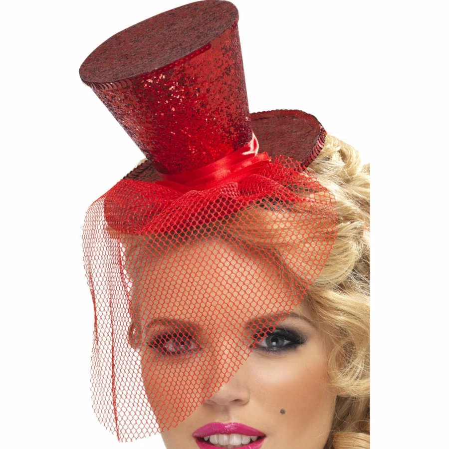 Complete your burlesque fancy dress costume with this adult Red Fever Mini Top Hat on Headband with detachable netting and a coordinating ribbon band.