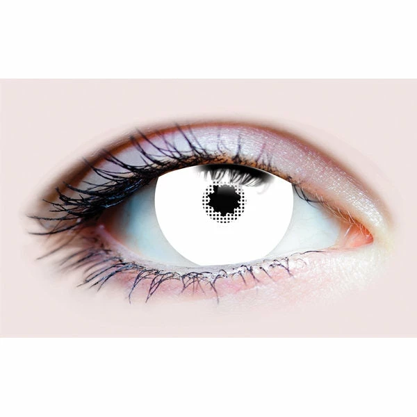 White mini scleral 15.2mm costume primal contact lenses will help you complete your Halloween costume. Entire iris is white, the contact covers part of the pupil but you are still able to see. Perfect for zombies, ghosts and other Halloween creatures.