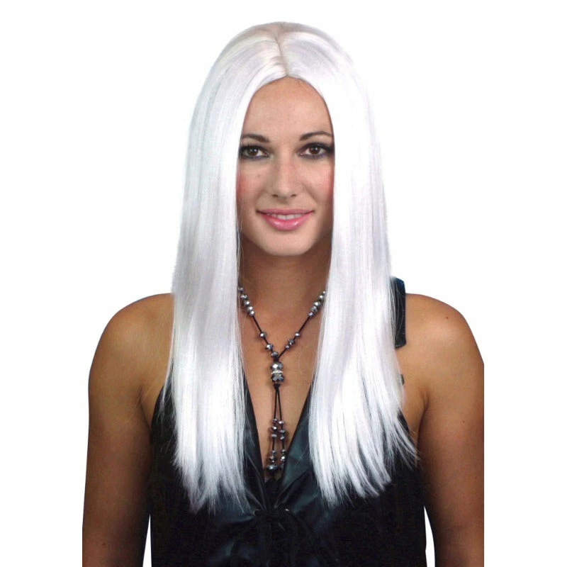 Long white center part wig, sleek finish.